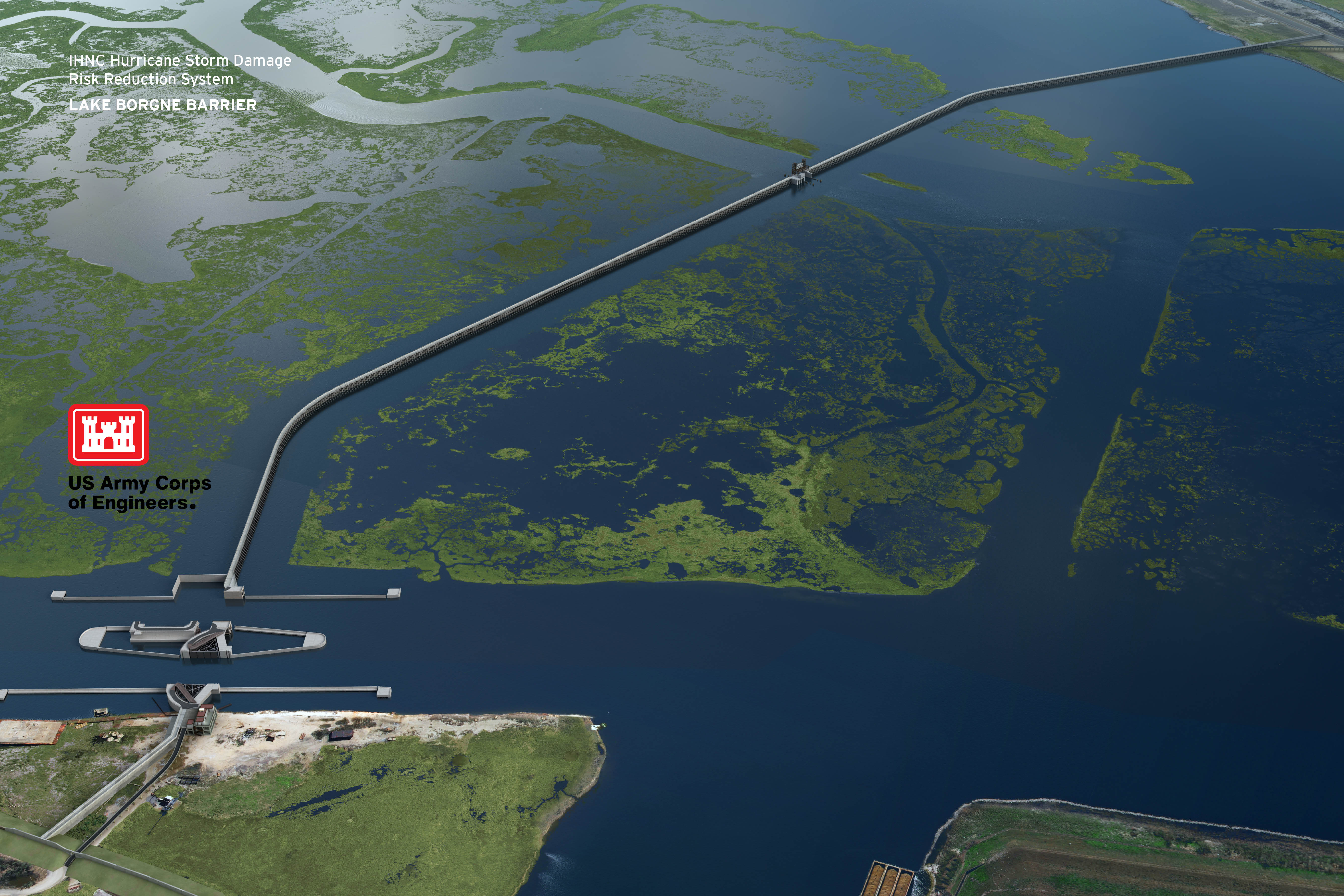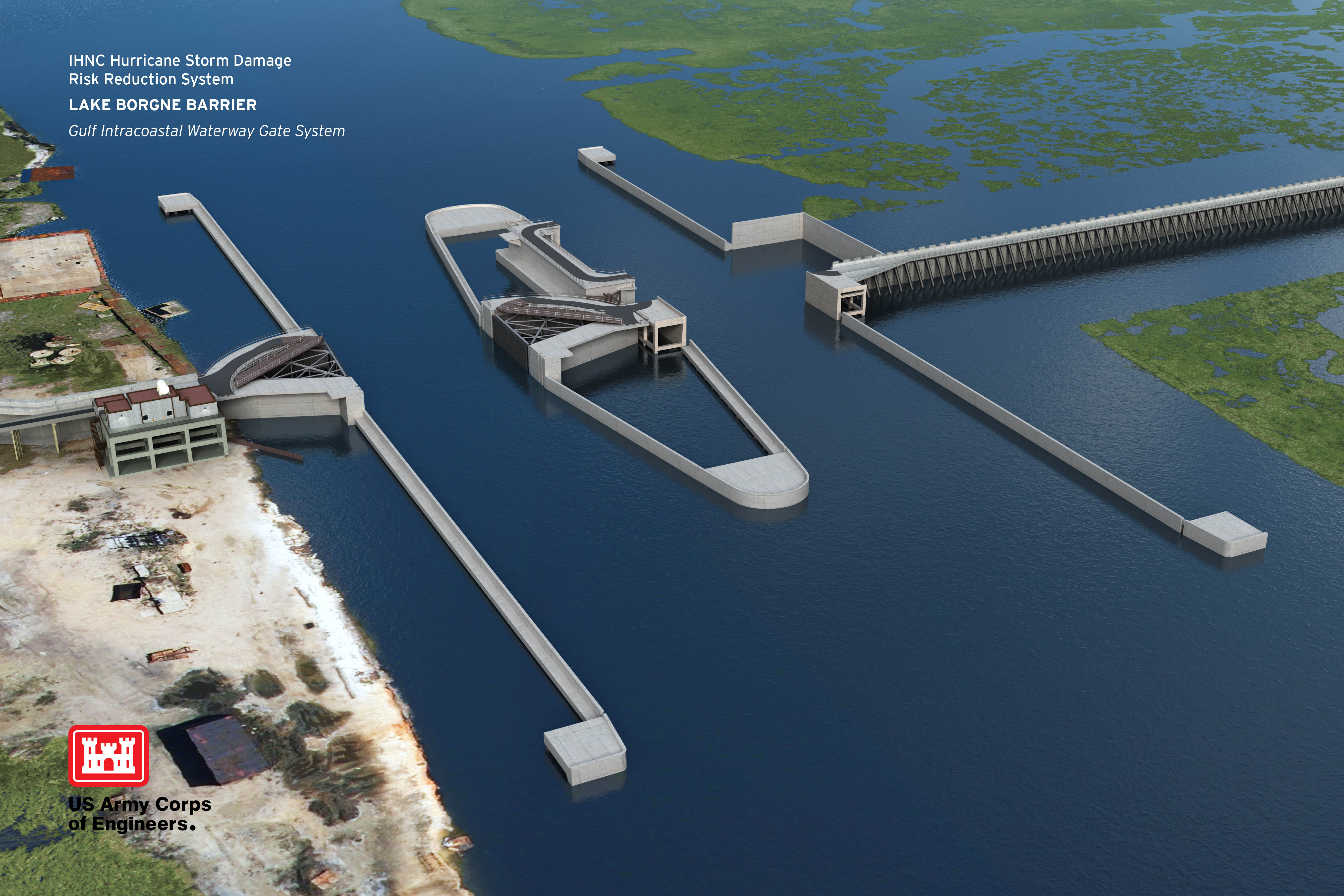 Join us for an engineer’s delight! The Inner Harbor Navigation Canal (INHC) Lake Borgne Surge Barrier is the largest design-build civil works project in the history of the US Army Corps of Engineers. The 1.8 mile concrete barrier wall, designed to reduce the risk associated with a storm surge, is located at the confluence of the Gulf Intracoastal Waterway (GIWW) and the Mississippi River Gulf Outlet (MRGO), about 12 miles east of downtown New Orleans. It includes a bypass barge gate and a flood control sector gate, each 150 feet wide, at the GIWW; and a 56-foot-wide vertical lift gate at the Bayou Bienvenue.